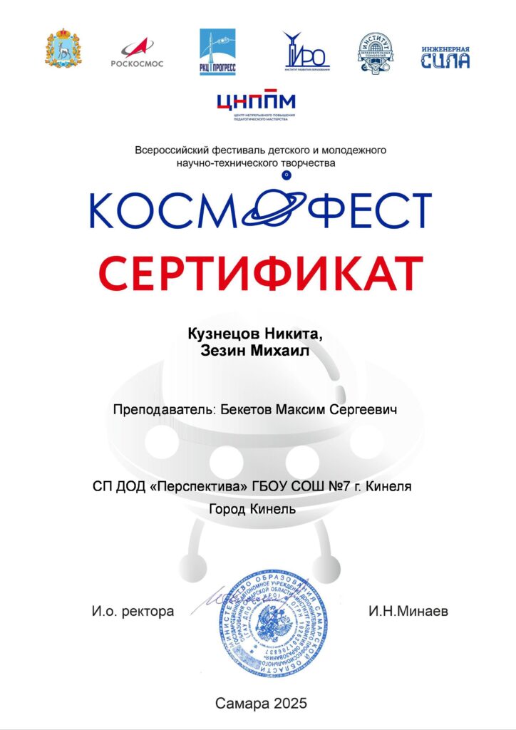22 апреля 2025 года были подведены результаты всероссийского фестиваля детского и молодёжного научно-технического творчества «КосмоФест» — 2025. Команда из двух обучающихся мини-технопарка «Квантум» СП ДОД «Перспектива» ГБОУ СОШ №7 г. Кинеля под руководством педагога дополнительного образования Бекетова М.С. приняли участие в номинации «Космические аппараты» с работой «ЭкоЛуна».