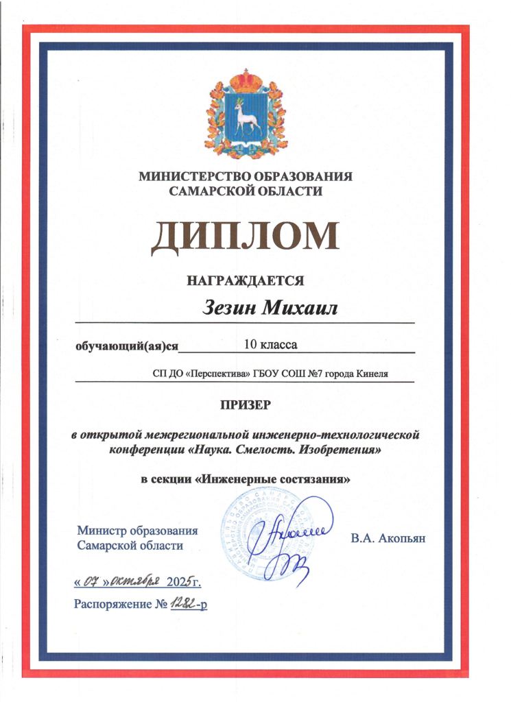 С 6 по 8 октября 2025 года две команды по 2 обучающихся мини-технопарка «Квантум» СП ДОД «Перспектива» ГБОУ СОШ №7 г. Кинеля под руководством педагога дополнительного образования Бекетова М.С. успешно выполнили задания очного этапа межрегиональной инженерно-технологической конференции «Наука. Смелость. Изобретения», проходящей на территории лагеря Солнечный в Самарской области, Волжском районе, сельском поселении Воскресенка.