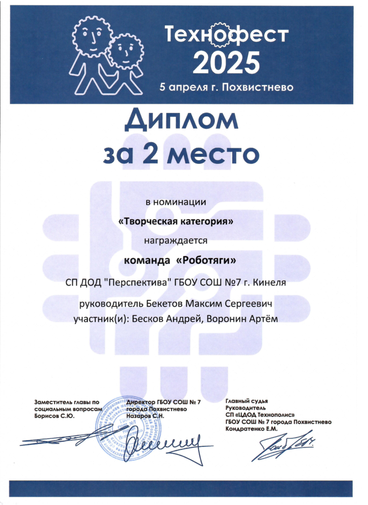5 апреля 2025 года две команды по два обучающихся мини-технопарка «Квантум» СП ДОД «Перспектива» ГБОУ СОШ №7 г. Кинеля под руководством педагога дополнительного образования Бекетова М.С. приняли участие в открытом фестивале технического творчества и робототехники «Технофест». По результатам выступления команд в номинации «Ралли» ребята заняли 1 место, в номинации «Творческая категория» — 2 место. Поздравляем юных инженеров и желаем дальнейших успехов!